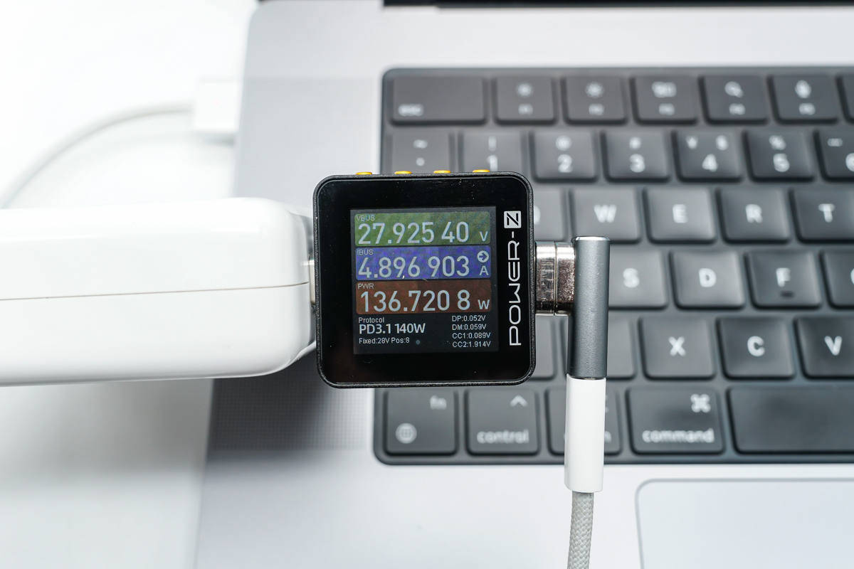 Isegi... see toetab ka 140W kiirlaadimist ning adapter on ühendatud Apple'i 140W galliumnitriidlaadija ja MagSafe 3 kiirlaadimiskaabliga. Sel ajal on laadimispinge 28 V ja võimsus 135,72 W.